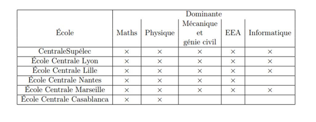 En outre, en fonction du cursus qu’elle propose, chaque École, décide des dominantes sur lesquelles elle admet les candidats. Le détail est donné dans le tableau ci-dessous.