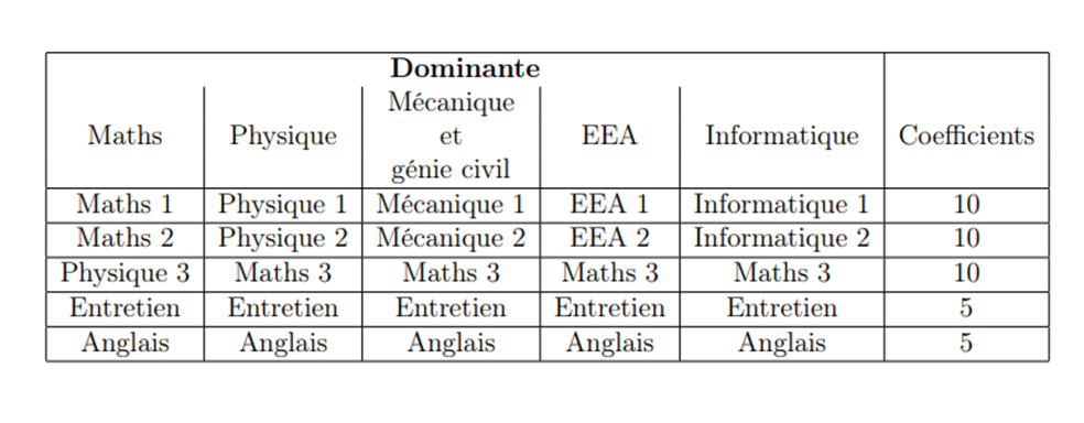Ce concours se décompose en cinq dominantes : Mathématiques ; Physique ; Mécanique et génie civil ; Électronique, énergie électrique, automatique (EEA) ; Informatique.